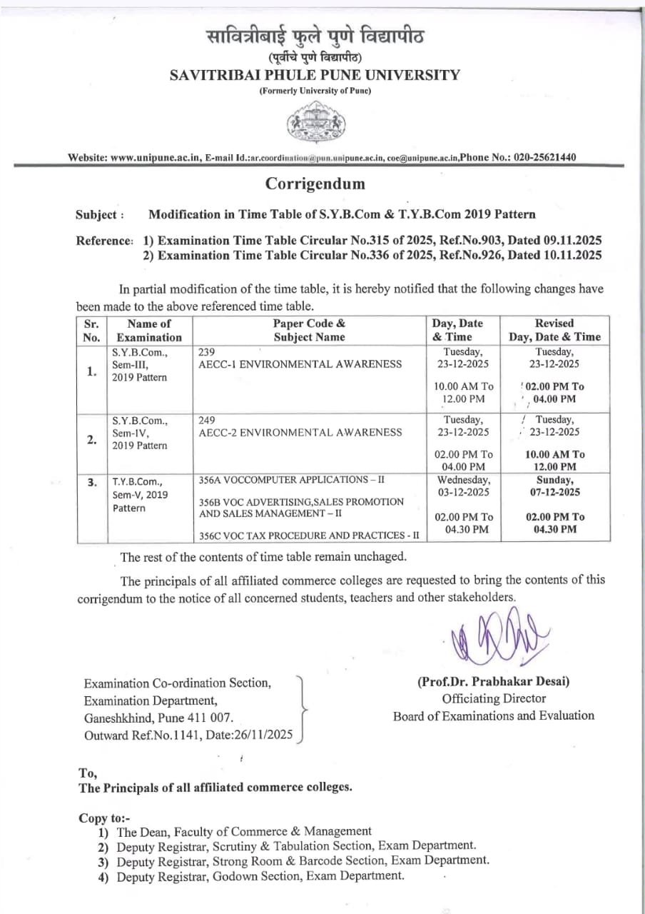 Corrigendum of Examination Time Table: S.Y.B.Com & T.Y.B.Com, 2019