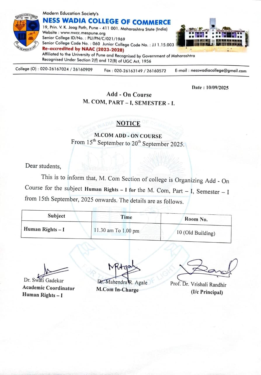 Notice : M.Com Add on Course Part-I Sem-II Human Rights