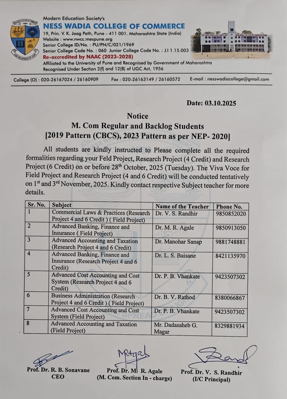 Research Project Viva M. Com. Part-II, Semester -III (Backlog) and (M. Com. Part-II, Semester -IV (Regular Students) [2023 Credit Pattern]